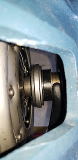 I know what you're thinking. You raised the torque tube up and supported it with the dreaded 2x4. Bonk is not something that we should hear! Sadly, bonk is what we heard. So, back into the bellhousing it goes. Now, I'm laying on my back, hanging shop light lighting the space under the truck and staring at the torque tube. Time passes with no illuminating thoughts. Time to try again, because honestly, you probably just screwed it up, noob. Back it goes...and...BONK! Crap! Forward it goes. This sucks. I know, let's try to raise the torque tube back up the the cab floor. Remember when we lowered it to the 2x4? Maybe we should have gotten the transmission out before lowering it? Worth a try. So back to the floor jack, up goes the torque tube, back goes the transmission and...wait for it...BONK! WTFO? It's not supposed to be this way. Things were going so well! Ok, time to put it back forward. Umm, what's happening? It won't go forward anymore! Did the end get spun around so that the input shaft does not align with the clutch disk anymore?!? Oh no! I can't go forward and I can't go backward! I know, I'll try to spin the universal on purpose, maybe I can get them aligned again. Well, after several minutes of trying, I had to call "no joy" on that mission. Good grief! It (the transmission) is literally stuck halfway in and halfway out. That's it, I'm wiped out and time for calling it a day. (For clarity sake, the preceding was also spread over many days of work in the garage.)